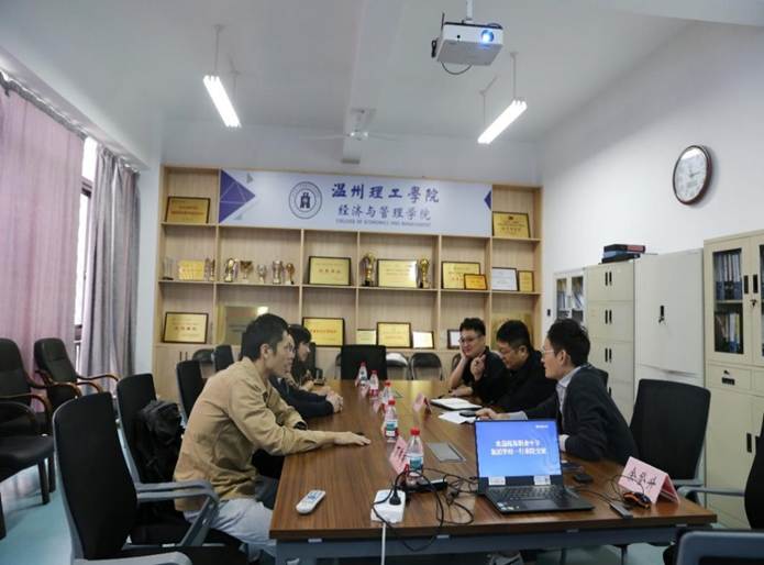 随后,温州理工学院经济与管理学院副院长谢翠华和跨境电商专业负责人与瓯海职专副校长陈冬峰一行5人,在学院会议室召开了中本一体化人才培养专题座谈会。首先,双方交流了目前中本一体化项目开展情况。其次,双方就中职阶段的核心技能培养与本科阶段的理论深化、创新能力提升如何实现无缝对接进行了深入探讨,致力于打造一套科学、连贯的一体化课程体系。最后,研讨聚焦于更具前瞻性与战略性的议题——未来两校在后续推进中本一体化培养成果转化的可能性。