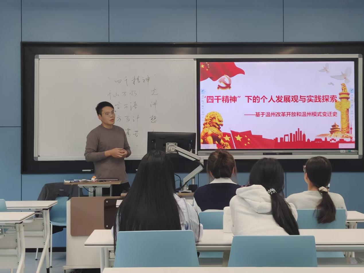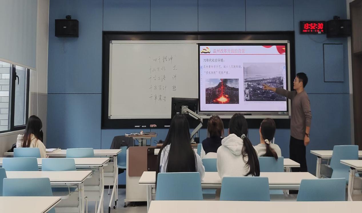 课堂上,余豪骥副书记从温州改革开放的四个阶段展开,系统讲述了从“燎原星火”的包产到户探索,到“潮涌瓯江”的民营经济崛起,再到新时代“温州模式”的创新发展。他强调,“走遍千山万水、说尽千言万语、想尽千方百计、吃尽千辛万苦”的“四千精神”,不仅是温州企业家的创业基因,更是当代大学生在实践育人中不可或缺的精神素养。