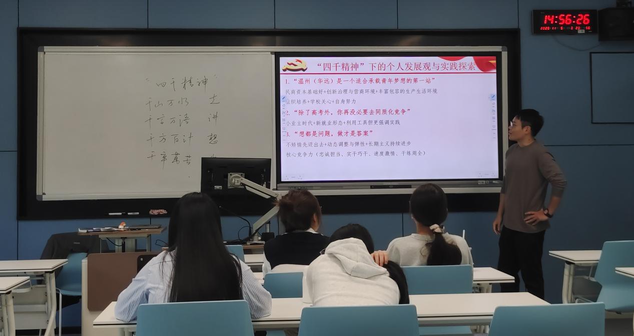 2025年11月5日下午,温州理工学院经济与管理学院党委副书记余豪骥为“华远班”全体学员讲授题为《“四千精神”下的个人发展观与实践探索——基于温州改革开放和温州模式变迁史》的开班第一课。课程以温州民营经济发展历程为脉络,深入阐释“四千精神”的时代内涵,并将其与“华远班”校企协同育人模式紧密结合,为学员树立扎根实业、敢闯敢试的职业发展观。
