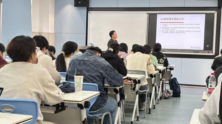 课堂上,韦永贵老师围绕国际贸易术语的责任划分,系统梳理了FOB、CFR、CIF等术语的异同及其价格换算逻辑。结合当前贸易环境与具体案例,他引导学生分析运输、支付等多重因素对成交价格的影响,并通过成本核算实例,强化学生对出口盈亏关键指标的理解,提升学生在实际贸易中的定价与核算能力。
