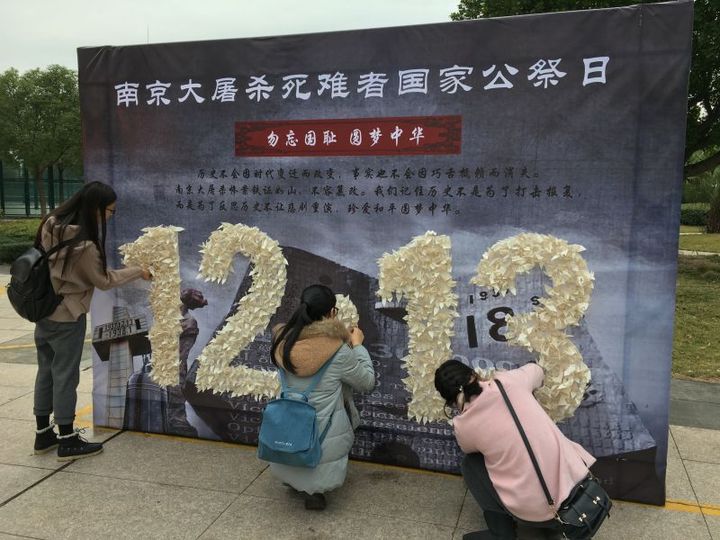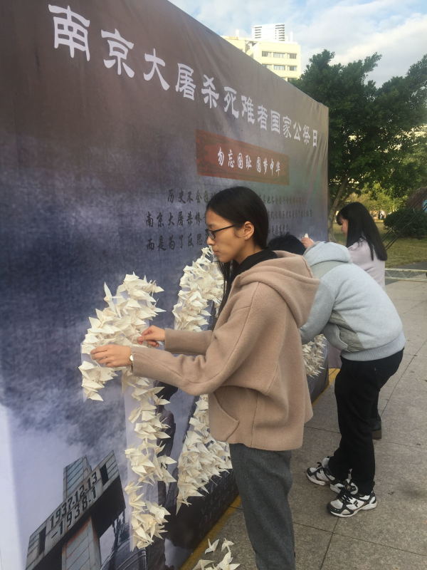 12月12日,该校学生用蜡烛摆出“12.13”的字形,同时高喊着“勿忘国耻·振兴国家”的口号,向过往师生发放“公祭”传单。师生们还在学校广场设立了主题纪念墙,通过千纸鹤写哀思、贴哀思,用独特的方式迎接第三个国家公祭日的到来,激发师生众志成城的爱国之情。
