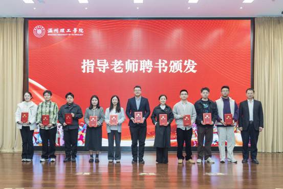 温州理工学院党委委员、宣传部部长、统战部常务副部长林盛光为“石榴红”宣讲团指导老师颁发聘书,为这支队伍在“石榴红”的旗帜下注入薪火相传的动能,拥有了同心前行的牵引力。